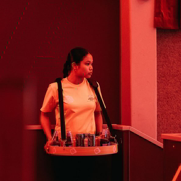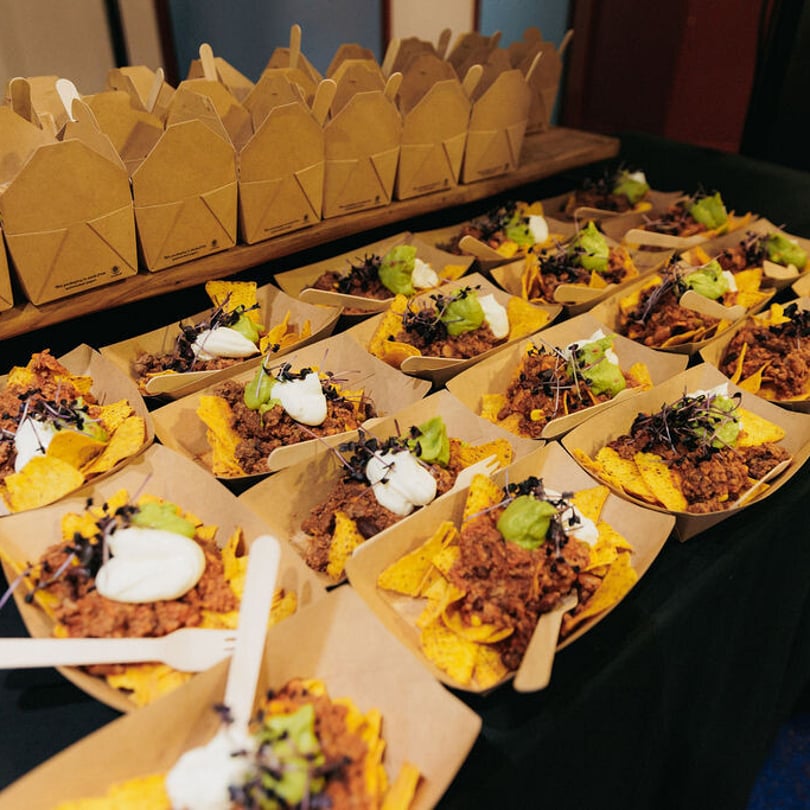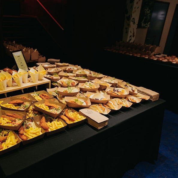 “Vendor trays” roaming the venue – inspired by stadium snacks – for a fun and functional catering experience